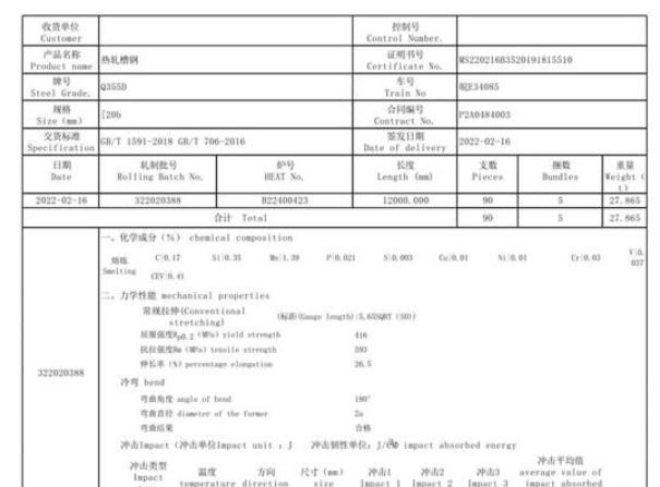 屈服強度(MPa)416,抗拉強度(MPa)593,伸長率26.5,槽鋼彎曲角度180度。